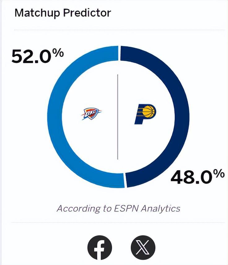 ESPN预测这场G4,雷霆客场作战赢球概率52%,主场作战的步行者只有48%的赢球概率。