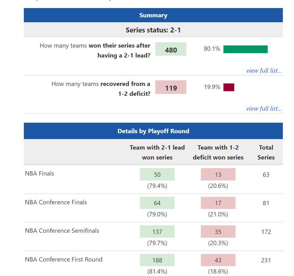 步行者2-1领先,根据NBA历史来看,480胜119负,晋级概率是80.1%,从历史来看步行者的夺冠概率更高。